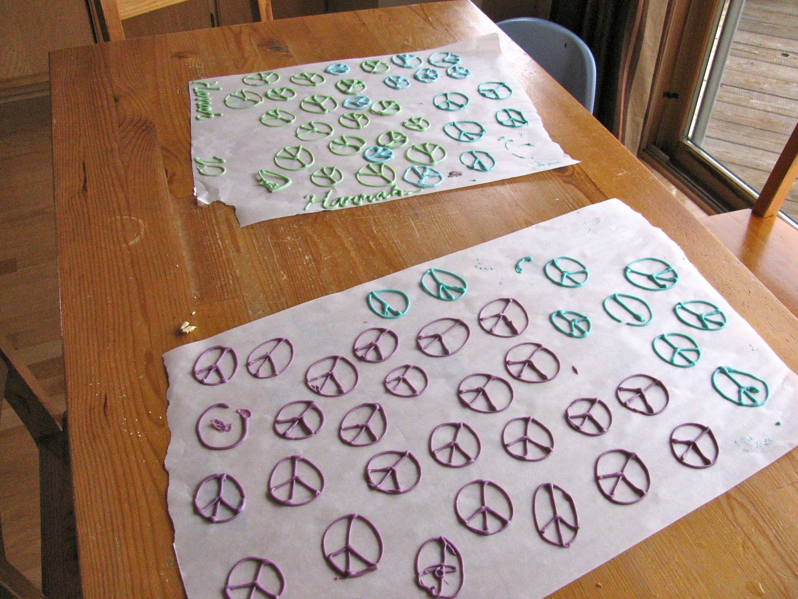 I melted and colored my white candy melts turquoise and lime green, then piped them in the shape of peace signs onto parchment paper. I also melted the lavender melts and piped them out as well.